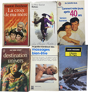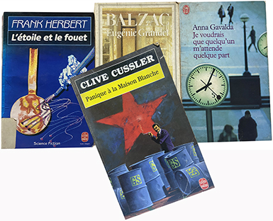 Anna Gavalda, Gaston Bonheur, Clive Cussler, Jack Higgins, Frank Herbert, A.E. Van Vogt, Balzac, Nadia Julien, Docteur David Elia